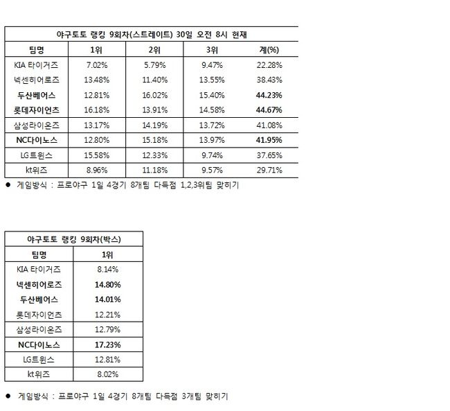 이번 야구토토 랭킹 9회차 게임은 경기시작 10분전인 31일 오후 6시 20분에 발매가 마감되며, 경기가 모두 종료된 후에 결과가 공식 발표된다.