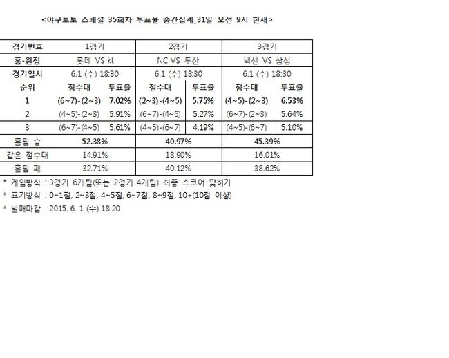한편, 주중에 벌어지는 국내프로야구 3경기를 대상으로 하는 야구토토 스페셜 35회차 게임은 오는 6월 1일 오후 6시 20분에 발매가 마감되며, 경기가 모두 종료된 후에 적중결과가 공식 발표된다.