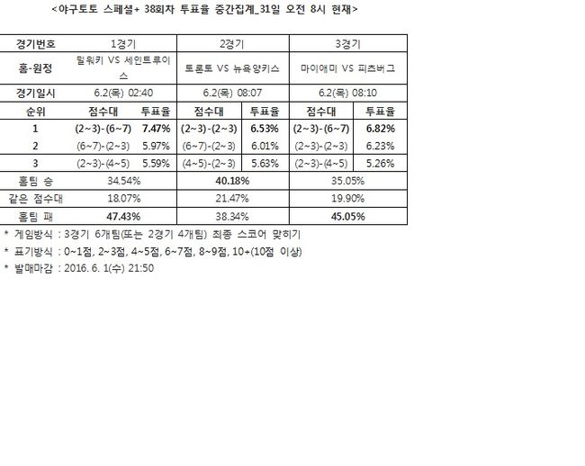 한편 MLB 3경기를 대상으로 하는 야구토토 스페셜+ 38회차 게임은 오는 6월 1일 밤 9시 50분에 발매가 마감되며, 경기가 모두 종료된 후에 적중결과가 공식 발표된다.