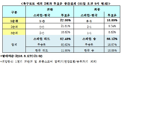 체육진흥투표권 스포츠토토의 수탁사업자인 케이토토(www.ktoto.co.kr)는 오는 6월 1일(수) 밤 11시30분에 오스트리아 잘츠부르크에서 벌어지는 국가대표평가전 스페인(홈)-한국(원정)전을 대상으로 한 축구토토 매치 2회차 투표율 중간집계 결과, 전체 참가자의 68.12%가 한국의 고전을 전망했다고 밝혔다.