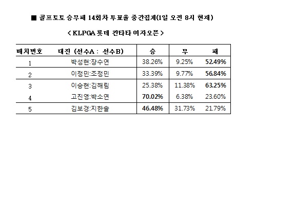 체육진흥투표권 스포츠토토의 수탁사업자인 케이토토는(www.ktoto.co.kr)는 오는 3일(금)에 롯데스카이힐 제주CC에서 열리는 ‘KLPGA 롯데 칸타타 여자오픈’ 1라운드를 대상으로 한 골프토토 승무패 14회차 1번 매치에서 B선수인 장수연(52.49%)이 A선수인 박성현(38.26%)보다 좋은 성적을 기록할 것으로 예상했다고 밝혔다.