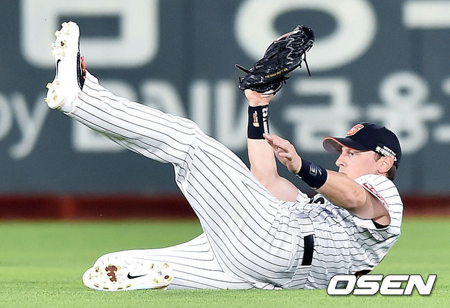 여기서 김선민에게 맞은 잘맞은 타구가 중견수 방면으로 날아갔다. 중견수 아두치 앞쪽으로 떨어질 듯한 타구. 하지만 아두치는 앞으로 빠르게 달려와 슬라이딩 캐치를 했고 타구를 걷어냈다. 이닝 종료. 1점 차의 살얼음판 리드를 이어가는 완벽한 호수비였다.