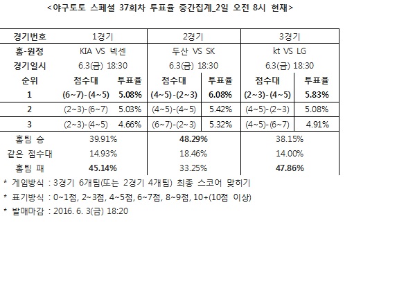 체육진흥투표권 스포츠토토의 수탁사업자인 ㈜케이토토(www.ktoto.co.kr)는 3일(금)에 열리는 2016시즌 한국프로야구(KBO) 3경기를 대상으로 한 야구토토 스페셜 37회차 투표율을 중간 집계한 결과, 참가자의 45.14%가 KIA-넥센(1경기)전에서 넥센의 승리를 전망했다.