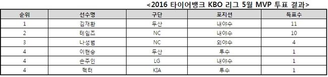 김재환은 KBO 리그 출입기자단 투표에서 유효표 28표 중 11표(39.3%)를 획득하며 10표를 얻은 NC 에릭 테임즈에 단 1표 차이로 5월 MVP로 선정됐다. NC 나성범은 4표로 3위를 차지했으며 두산 이현승, LG 손주인, KIA 헥터 노에시가 각각 1표씩 획득했다.