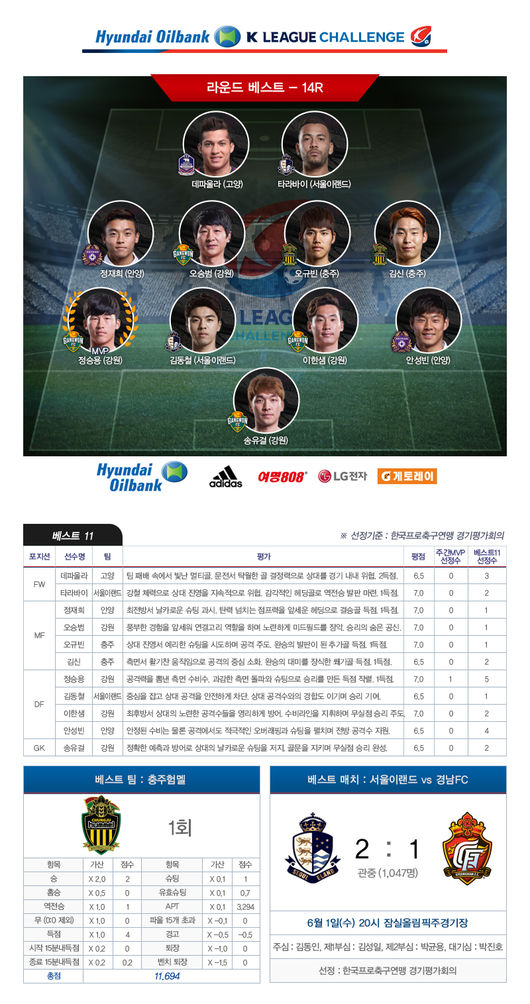 라운드 베스트 일레븐에는 공격수 데파울라(고양), 타라바이(서울 이랜드), 미드필더 정재희(안양), 오승범(강원), 오규빈, 김신(이상 충주), 수비수 정승용, 김동철(서울 이랜드), 이한샘(강원), 안성빈(안양), 골키퍼 송유걸(강원)이 이름을 올렸다./dolyng@osen.co.kr