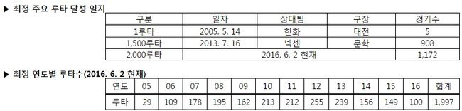 109루타로 첫 세 자릿수 루타를 기록한 2006년부터 2015년까지 10년 연속 세 자릿수 루타를 달성했으며 올해도 지난 2일까지 100루타로 11년 연속 기록을 이어가고 있다.