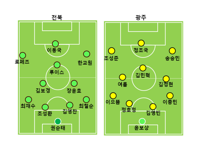 광주도 이후 공격 찬스서 조성준의 패스를 받은 송승민의 슈팅이 권순태에게 막혔다. 전북은 전반 막판 루이스의 슈팅이 골문을 비껴갔다.