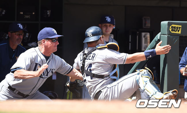 6일(한국 시각) 미국 미네소타주 미니애폴리스 타겟 필드에서 열린 '2016 메이저리그' 미네소타 트윈스와 탬파베이 레이스의 경기, 4회말 2사 탬파베이 행크 콩거가 미네소타 박병호의 파울 타구를 잡은 뒤 더그아웃으로 넘어지고 있다.