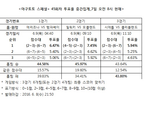 한편 MLB 3경기를 대상으로 하는 야구토토 스페셜+ 45회차 게임은 오는 8일 밤 9시 50분에 발매가 마감되며, 경기가 모두 종료된 후에 적중결과가 공식 발표된다.