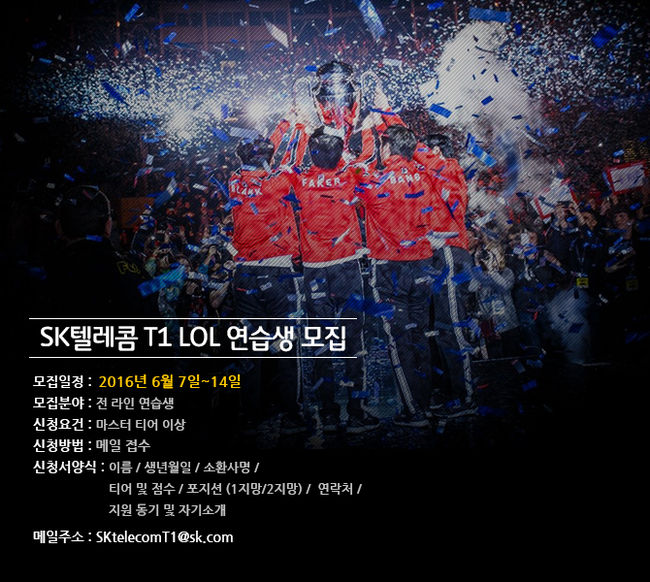 SK텔레콤 연습생 모집 기간은 7일부터 오는 14일까지며, 솔로 랭크 마스터 등급 이상이면 신청이 가능하다. 지원서에 이름, 생년월일, 소환사명, 티어 및 점수, 포지션(지망, 2지망), 연락처, 지원 동기 및 자기소개서를 적어 메일로 접수하면 된다.