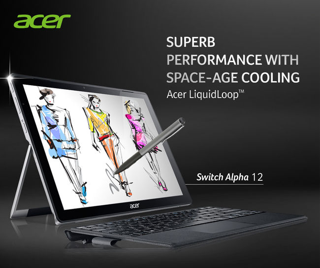 스위치 알파 12는 업계 최초로 선보이는 수냉식 투인원 노트북으로 6세대 인텔 코어 i5 프로세서와 윈도우 10이 탑재되어 있다.