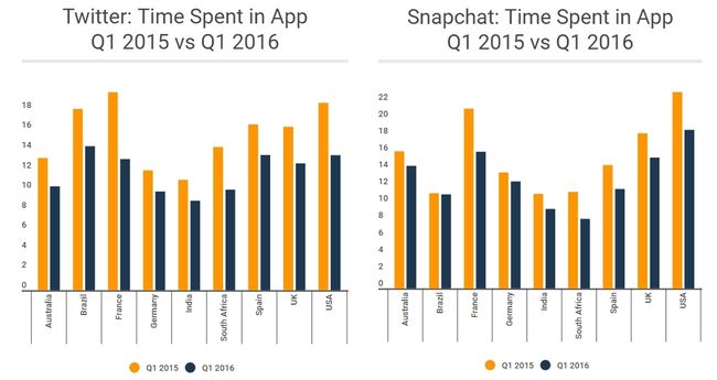 이는 런던에 본사를 두고 있는 데이터 수집 업체 시밀러웹(Similar Web)이 9개 국가(호주, 브라질, 프랑스, 독일, 인도, 남아프리카, 스페인, 영국, 미국) 안드로이드 사용자를 대상으로 한 연구 데이터 결과에서 드러났다. 시밀러웹은 대표적인 4대 SNS인 페이스북, 인스타그램, 트위터, 스냅챗의 2015년 1분기와 2016년 1분기 사용시간을 비교했다.