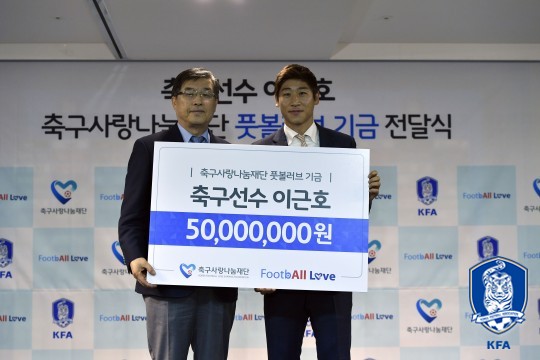 이근호는 “축구를 하면서 주위에서 도움을 많이 받았다. 그래서 국가대표로도 뛸 수 있었다”면서 “축구로 받은 사랑을 돌려주기 위해 지난해부터 기부를 하고 있다. 나를 통해 릴레이로 기부하면 좋겠다. 할 수 있을 때까지 이어가겠다”고 말했다.