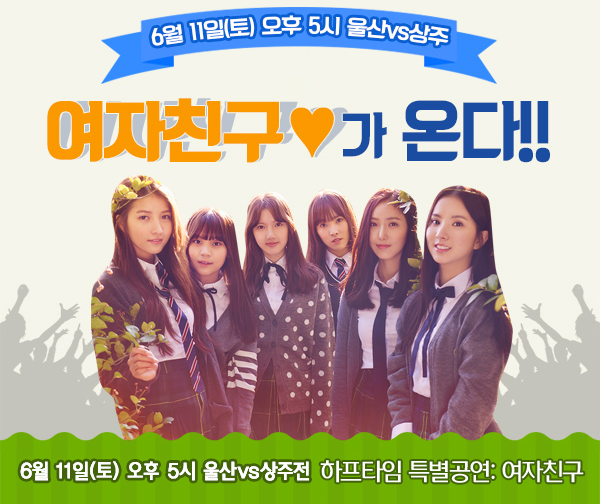 오는 11일 오후 5시 문수축구경기장에서 열리는 현대오일뱅크 K리그 클래식 2016 울산현대와 상주 상무의 경기에 인기 아이돌그룹 ‘여자친구’(소원, 예린, 은하, 유주, 신비, 엄지)가 뜬다. 여자친구는 이날 전반 종료 후 하프타임 특별공연을 펼칠 예정이다.