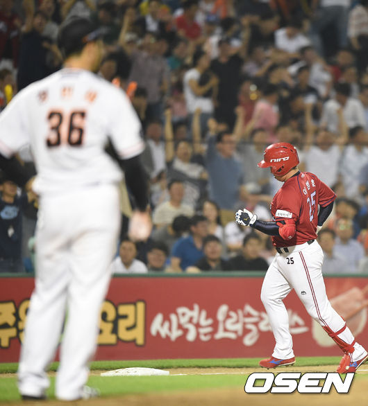 1사 1·3루 찬스에서 타석에 들어선 이범호는 무실점으로 호투하던 장민재와 풀카운트 승부를 벌였다. 이어 6구째 몸쪽으로 들어온 140km 직구를 공략, 좌측 담장을 넘어가는 스리런 홈런으로 연결했다. 비거리 110m, 시즌 9호 홈런. 3-0 기선제압의 한 방이었다. /waw@osen.co.kr