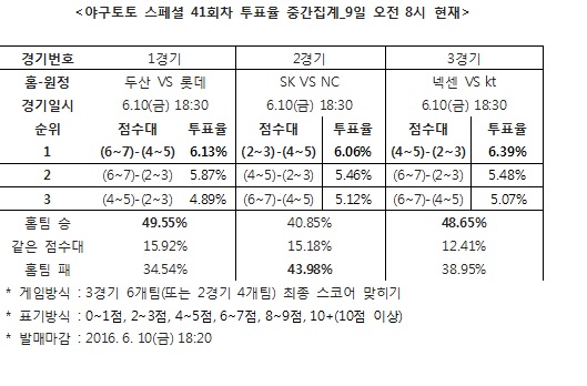 체육진흥투표권 스포츠토토의 수탁사업자인 ㈜케이토토(www.ktoto.co.kr)는 6월 10일(금)에 열리는 2016시즌 한국프로야구(KBO) 3경기를 대상으로 한 야구토토 스페셜 41회차 투표율을 중간 집계한 결과, 2경기 SK-NC전에서 양팀의 투표율이 거의 비슷하게 나와 치열한 접전을 펼칠 것으로 나타났다고 밝혔다.