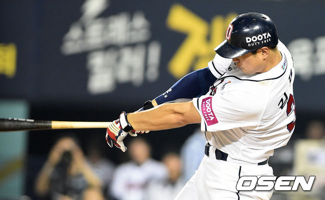 김재환은 10일 잠실구장에서 열린 2016 타이어뱅크 KBO리그 롯데 자이언츠와의 경기에서 팀이 5-4로 맞서던 5회말 1사 1루에 나와 조시 린드블럼을 상대로 볼카운트 3B-2S에서 6구째를 공략해 우측 담장을 넘기는 스리런홈런을 뽑아냈다. 자신의 시즌 17호 홈런. 이 홈런으로 김재환은 에릭 테임즈(NC)와 이 부문 공동 선두가 됐다. /nick@osen.co.kr