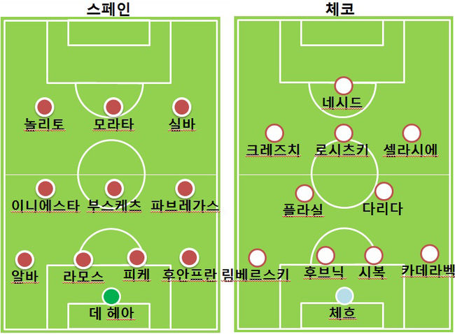 스페인은 놀리토, 모라타, 실바 스리톱을 내세웠다. 이니에스타, 부스케츠, 파브레가스가 중원을 맡았다. 알바, 라모스, 피케, 후안 프란이 포백을 서고 디 헤아가 골키퍼로 나온 4-3-3 라인업이었다. 체코 역시 중원 사령관 로시츠키와 골키퍼 체흐를 앞세워 맞섰다.
