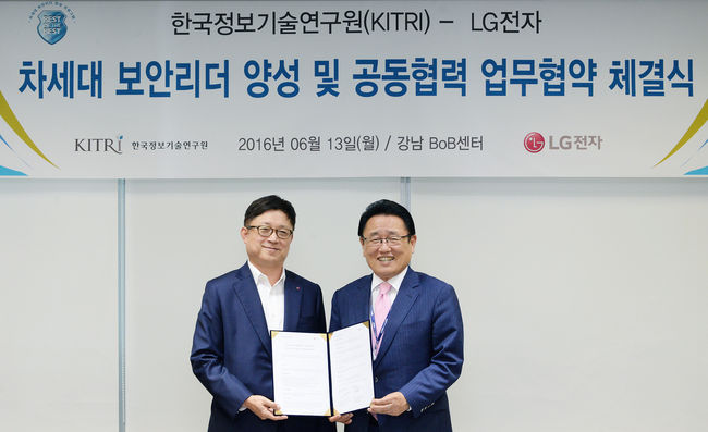LG전자는 14일 보도자료를 통해 한국정보기술연구원(KITRI)과 ‘IT 보안 전문가 양성 및 협력에 관한 양해각서(MOU)’를 체결했다고 밝혔다. 체결식은 지난 13일 KITRI 강남 BoB 교육센터에서 실시됐으며, 민경오 LG전자 소프트웨어센터장(부사장), 유준상 한국정보기술연구원장 등이 참석했다