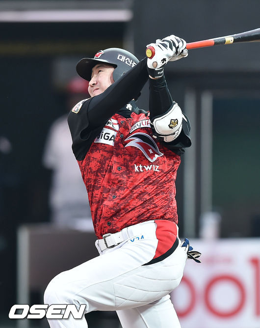 kt의 1-0 리드를 이끈 기선제압의 선제 홈런. 지난달 6일 수원 한화전에서 왼쪽 내전근 부상을 당한 뒤 38일 만에 1군으로 돌아온 유한준은 복귀 첫 타석부터 시원한 홈런포로 존재감을 알렸다. /waw@osen.co.kr