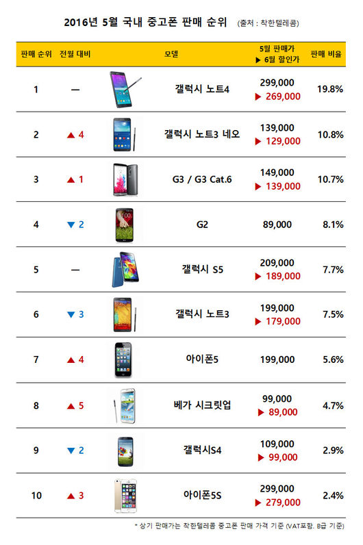 휴대폰 유통 벤처기업 착한텔레콤은 중고폰 쇼핑몰 세컨폰 및 오픈마켓, 소셜커머스, 번개장터, 다이소 휴대폰자판기 등을 통해 접수된 총 1502건의 주문을 분석한 중고폰 판매 순위를 공개했다. 갤럭시노트4는 전체 주문의 19.8%를 차지했으며 갤럭시노트3네오(10.8%), G3/G3 Cat.6(10.7%), G2(8.1%), 갤럭시S5(7.7%) 등이 뒤를 이었다.