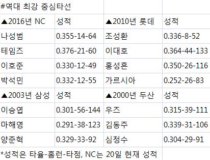 NC의 중심타선 '나테이박'이 역대 최강 장타력을 자랑하고 있다. 1998년 외국인 선수 제도가 도입된 이후 최강 중심타선으로 손색이 없다. 2000년 두산의 '우동수', 2003년 삼성의 '이마양', 2010년 롯데의 '조대홍갈' 중심타선을 능가한다.