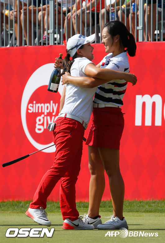 [사진] 마이어 LPGA 클래식 우승 트로피에 키스 포즈를 취하고 있는 김세영. 아래 사진은 김세영의 우승을 축하하며 함께 기뻐하고 있는 전인지. /ⓒAFPBBNews = News1(무단전재 및 재배포 금지)