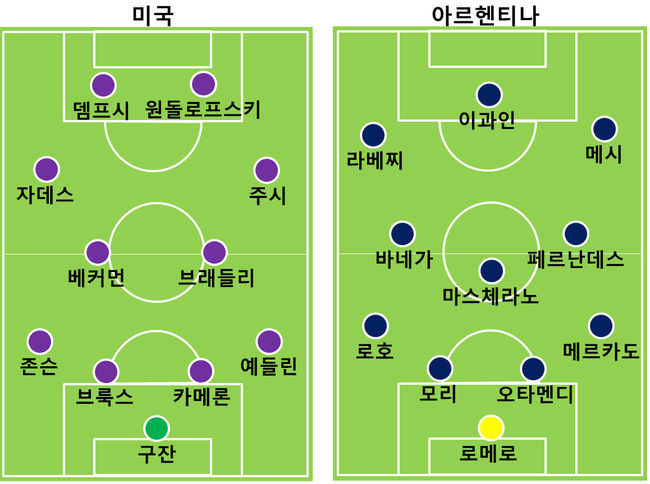 아르헨티나에 호재만 있었던 것은 아니다. 잇달아 부상자가 나와 선수 교체를 해야 했다. 아르헨티나는 후반 14분 아우구스토 페르난데스 대신 루카스 비글리아를, 후반 22분 라베찌 대신 에릭 라멜라를 투입했다. 이에 미국은 후반 15분 카일 베커맨를 빼고 스티브 번바움을 넣었다.