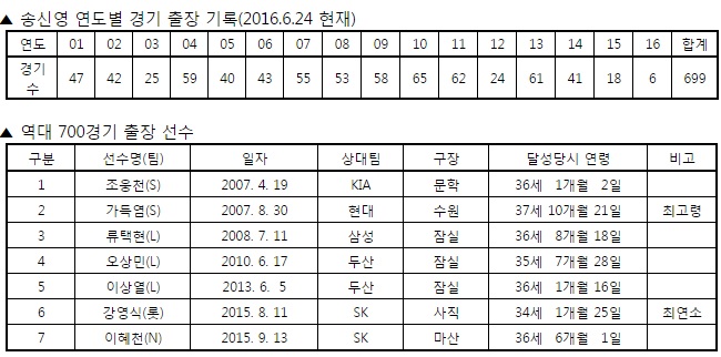 송신영은 KBO 리그 16시즌째인 올해 24일 현재 통산 699경기에 출장하고 있다. 역대로 700경기에 출장한 투수는 총 7명의 선수가 있었으며 송신영이 달성시 2007년 최초로 달성한 SK 조웅천 이후 통산 8번째이자 한화 소속으로는 첫 번째 선수가 된다. 또한 송신영은 6월 24일 현재 39세 3개월 23일로 종전 700경기 출장 최고령 기록이었던 가득염(당시 SK)의 37세 10개월 29일을 넘어 역대 최고령 투수가 된다.