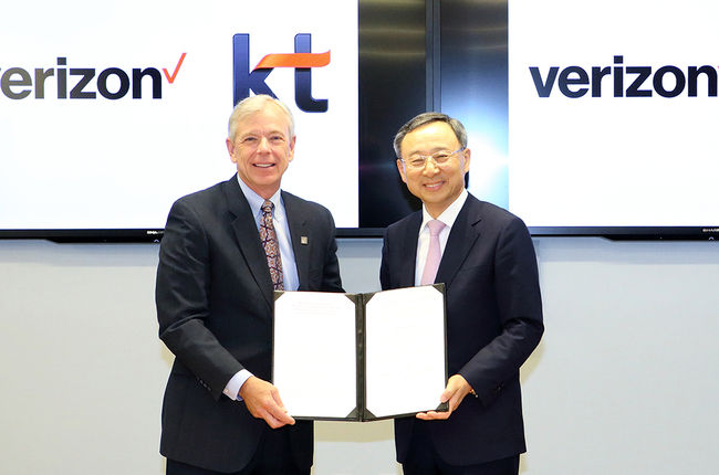 KT와 버라이즌은 지난 24일(현지시간) 미국 뉴저지주 배스킹리지 버라이즌 본사에서 KT 황창규 회장, 버라이즌 로웰 맥아담(Lowell McAdam) 대표 및 양사 주요임원이 참석한 가운데 ‘5G 이동통신을 포함한 미래 인프라 및 기술 협력에 대한 업무협약(MOU)’을 체결했다고 밝혔다.