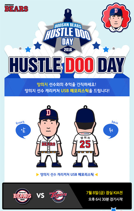 다음달 8일 실시하는 '허슬두데이'의 주인공은 두산의 ‘국가대표 안방마님’ 양의지다. 이날 두산은 특정 관중석(레드석 103-104 블럭)을 '허슬두데이존'으로 편성, 이 좌석을 이용하는 팬들에게 양의지의 캐리커처 USB 메모리스틱을 선물한다.