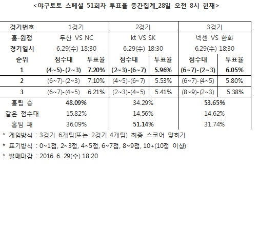 한편, 주중에 벌어지는 국내프로야구 3경기를 대상으로 하는 야구토토 스페셜 51회차 게임은 오는 29일 오후 6시 20분에 발매가 마감되며, 경기가 모두 종료된 이후에 적중결과가 공식 발표된다.