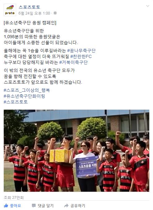 케이토토는 스포츠토토 공식 페이스북에 게재된 유소년 축구 응원 영상을 보고 후원 댓글의 수가 800명을 넘을 경우 유소년 축구팀에 300만원 상당의 축구 용품을 선물한다는 약속에 따라 환경이 넉넉하지 못한 축구팀을 찾아 푸짐한 선물을 전달했다.