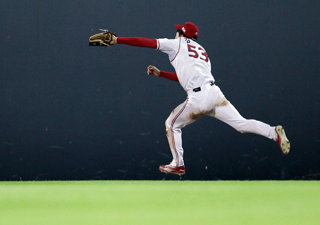 9회 초, 풀카운트 접전을 벌이던 롯데 정훈(29)이 홍건희(24, KIA)의 낮은 직구를 제대로 받아 쳤다. 전력으로 질주하며 왼팔을 뻗어 공을 잡아낸 김호령은 달려가던 속도를 이기지 못하고 그대로 담장에 부딪히며 한 바퀴 돌았지만 공을 지켜냈다.