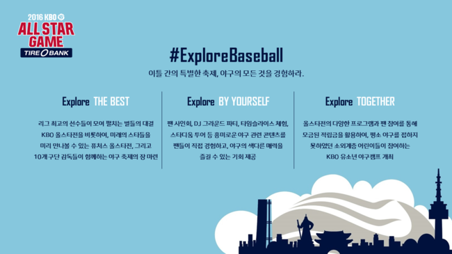 KBO(총재 구본능)는 7월 15일과 16일 양일간 서울 고척 스카이돔에서 개최되는 2016 타이어뱅크 KBO 올스타전의 슬로건을 ‘#ExploreBaseball’로 확정했다.