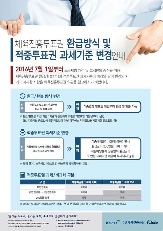 국민체육진흥공단이 발행하는 체육진흥투표권(이하 스포츠토토)의 환불 및 환급방식과 적중투표권의 과세기준이 오는 7월1일부로 변경된다.