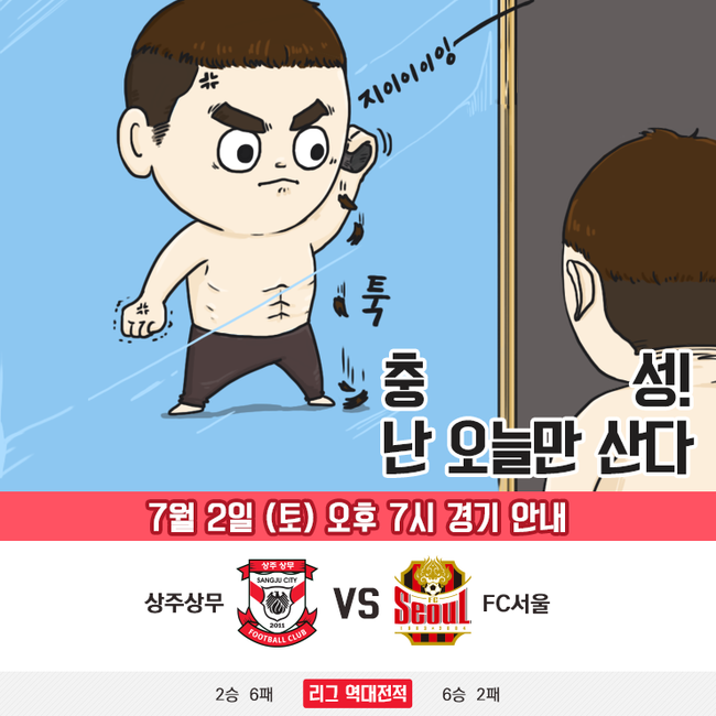 먼저 오는 7월 2일 저녁 7시 상주시민운동장에서 열리는 현대오일뱅크 K리그 클래식 18라운드의 상대는 FC서울이다. 상주상무는 올 시즌 첫 원정 경기였던 서울전서 4골을 실점한 바 있다. 하지만 지난 제주와의 원정에서 실점했던 4골을 홈경기에서 그대로 갚아주며 4-0 승리를 이끌어냈던 점, 홈경기에서 특히 강한 모습을 보이고 있다는 점에서 상주상무의 승리를 기대해볼 만하다.