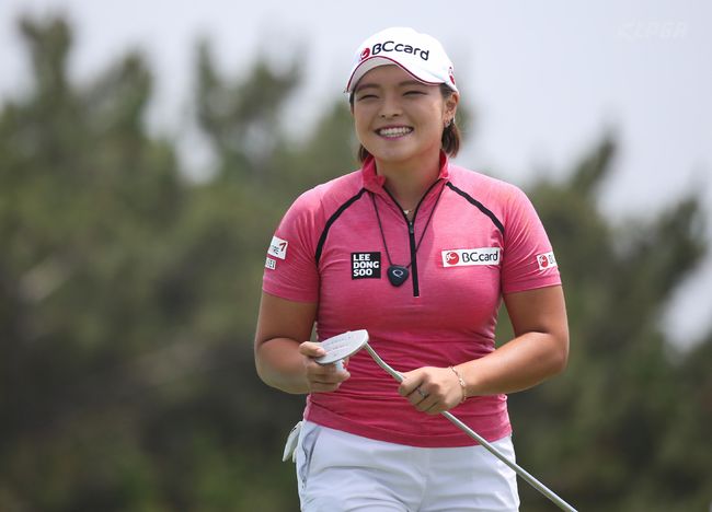 [사진] 2라운드 경기 도중 환하게 웃고 있는 장하나. 아래 사진은 장하나 펑샨샨 배선우가 이야기를 나누며 페어웨이를 이동하고 있는 모습. /KLPGA 제공.