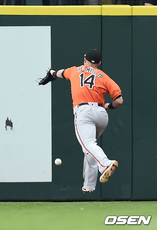 4회말 1사 1루 볼티모어 레이몰드가 시애틀 시거의 타구를 잡으려고 하고 있다.