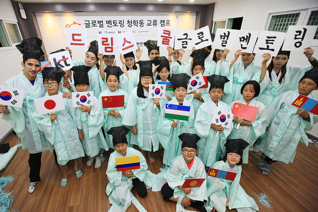 지난 7월 1일~2일 1박 2일간 청학동 묵계 초등학교와 기가서당 일대에서 진행된 ‘KT 드림스쿨 글로벌 멘토링 4기 청학동 교류캠프’에서는 멘토들 국가의 민속춤, 속담, 민속경기 등을 함께 익히고 체험했다. 또 청학동 훈장님께서 예절 교육, 초등학생 멘티의 가야금 공연도 함께 보면서 멘토와 멘티 상호간의 문화에 대한 이해도를 높이기 위한 프로그램들도 진행됐다.