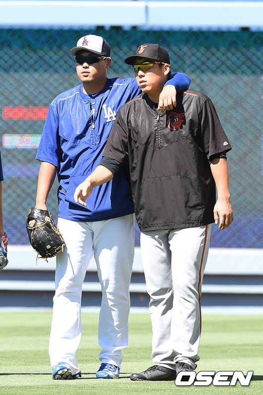 5일(한국 시각) 미국 캘리포니아주 로스앤젤레스 다저스타디움에서 열리는 '2016 메이저리그' LA 다저스와 볼티모어 오리올스의 경기에 앞서 다저스 류현진이 볼티모어 김현수와 이야기를 나누고 있다.