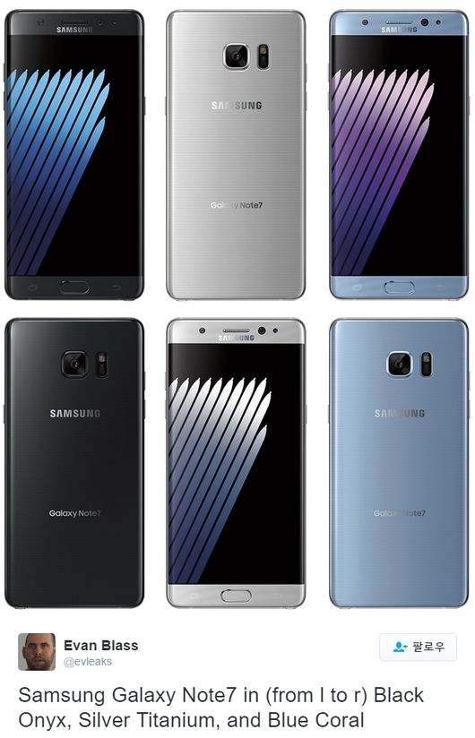 에반 블라스는 지난 1일 자신의 트위터에 왼쪽부터 오른쪽으로 블랙 오닉스, 실버 티타늄, 블루 코랄 색상의 삼성 갤럭시 노트 7이라며 6장의 사진을 올렸다. 이 중 블루 코랄은 전작 노트 5에서는 없었던 색상이다.