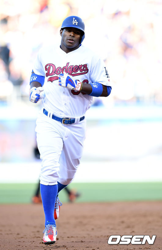 2회말 무사 다저스 푸이그가 솔로 홈런을 때린 뒤 베이스를 돌고 있다.