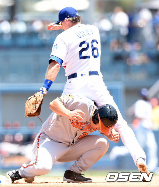 7일(한국 시각) 미국 캘리포니아주 로스앤젤레스 다저스타디움에서 열린 '2016 메이저리그' LA 다저스와 볼티모어 오리올스의 경기, 3회초 무사 1,3루 볼티모어 김현수가 마차도의 유격수 땅볼때 2루로 진루하려다 어틀리와 충돌하고 있다.