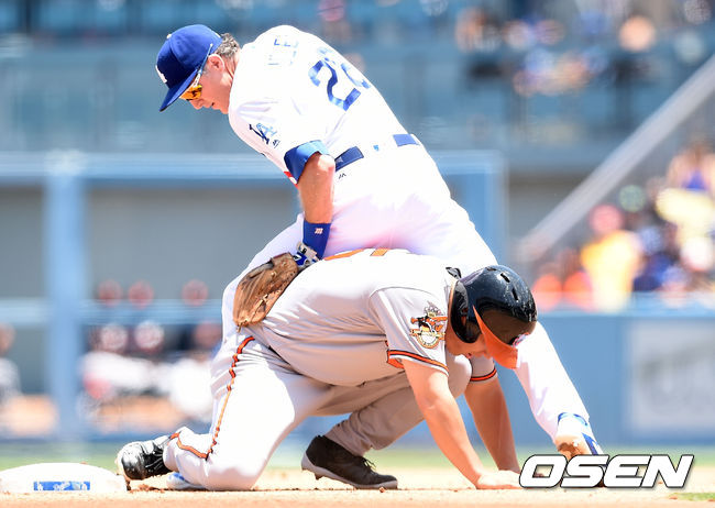 7일(한국 시각) 미국 캘리포니아주 로스앤젤레스 다저스타디움에서 열린 '2016 메이저리그' LA 다저스와 볼티모어 오리올스의 경기, 3회초 무사 1,3루 볼티모어 김현수가 마차도의 유격수 땅볼때 2루로 진루하려다 어틀리와 충돌하고 있다.