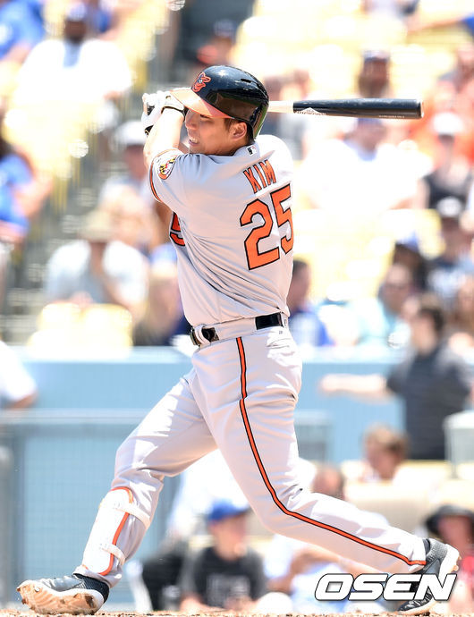 7일(한국 시각) 미국 캘리포니아주 로스앤젤레스 다저스타디움에서 열린 '2016 메이저리그' LA 다저스와 볼티모어 오리올스의 경기, 3회초 무사 1루 볼티모어 김현수가 안타를 때리고 있다.