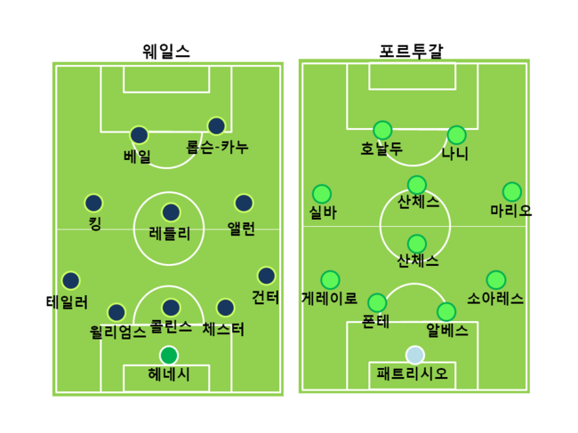 포르투갈은 전반 16분 마리오의 중거리 슈팅이 골문을 살짝 벗어났다. 웨일스는 베일의 연이은 슈팅이 무위에 그쳤다.