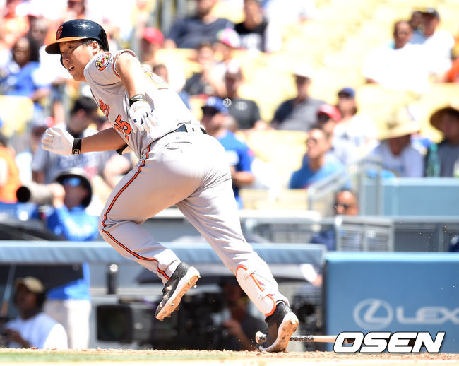 7일(한국 시각) 미국 캘리포니아주 로스앤젤레스 다저스타디움에서 열린 '2016 메이저리그' LA 다저스와 볼티모어 오리올스의 경기, 7회초 무사 볼티모어 김현수가 좌익수 뜬공으로 물러나고 있다.