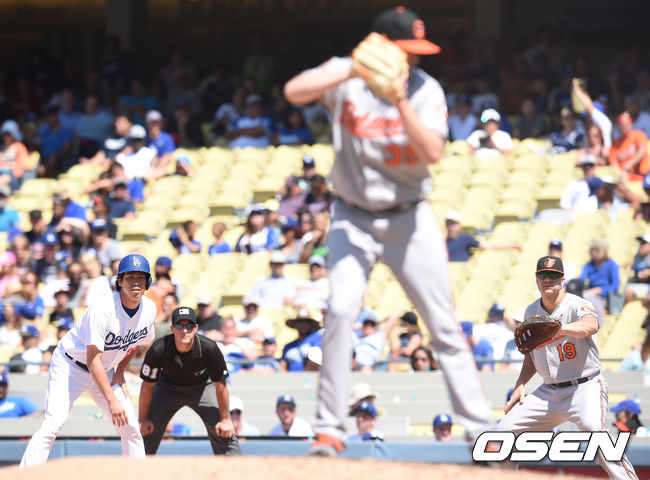 7일(한국 시각) 미국 캘리포니아주 로스앤젤레스 다저스타디움에서 열린 '2016 메이저리그' LA 다저스와 볼티모어 오리올스의 경기, 8회말 2사 1루 다저스 마에다가 A.J 엘리스의 대주자로 경기에 나서 주루 플레이를 하고 있다.