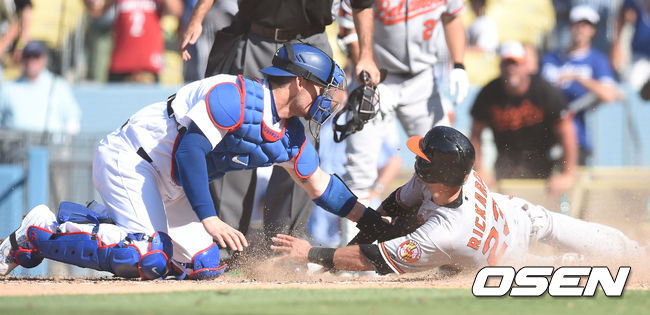 7일(한국 시각) 미국 캘리포니아주 로스앤젤레스 다저스타디움에서 열린 '2016 메이저리그' LA 다저스와 볼티모어 오리올스의 경기, 연장 13회초 2사 1루 다저스 그랜달이 볼티모어 아담 존스의 우전 안타때 홈으로 쇄도하는 리카드를 잡아내고 있다.